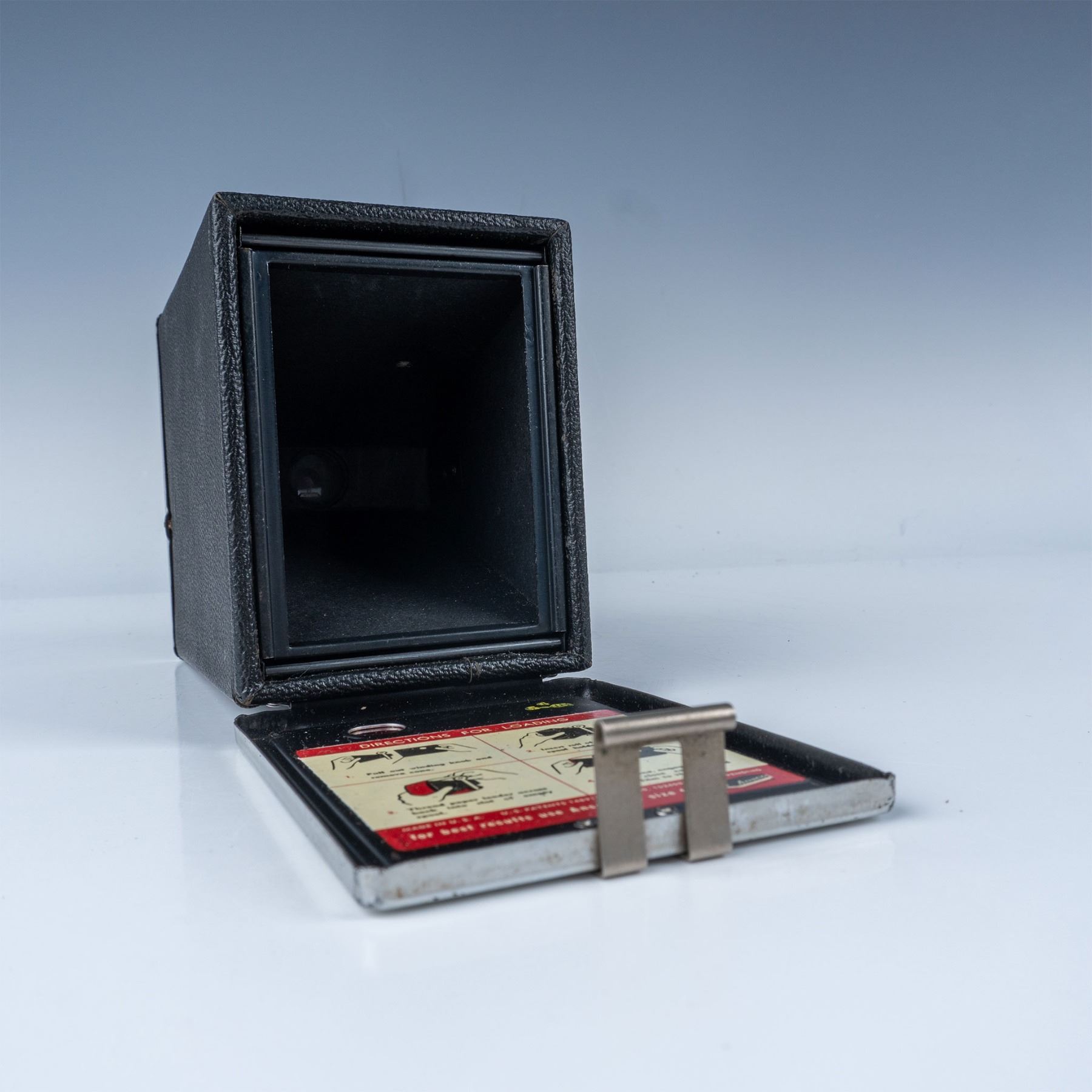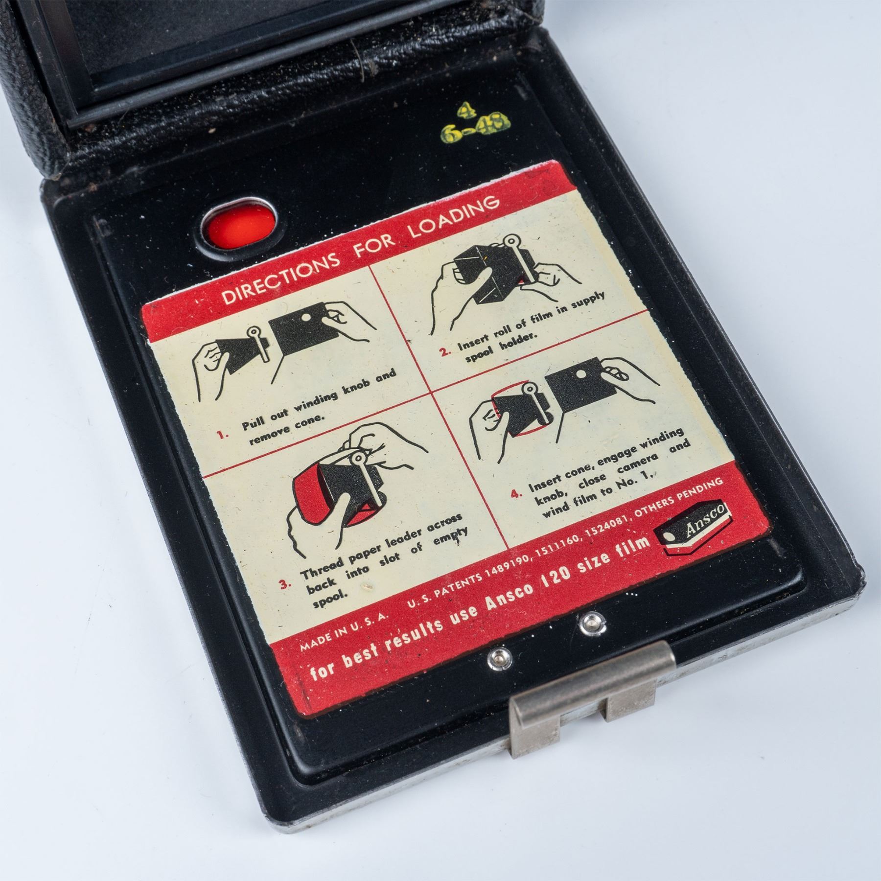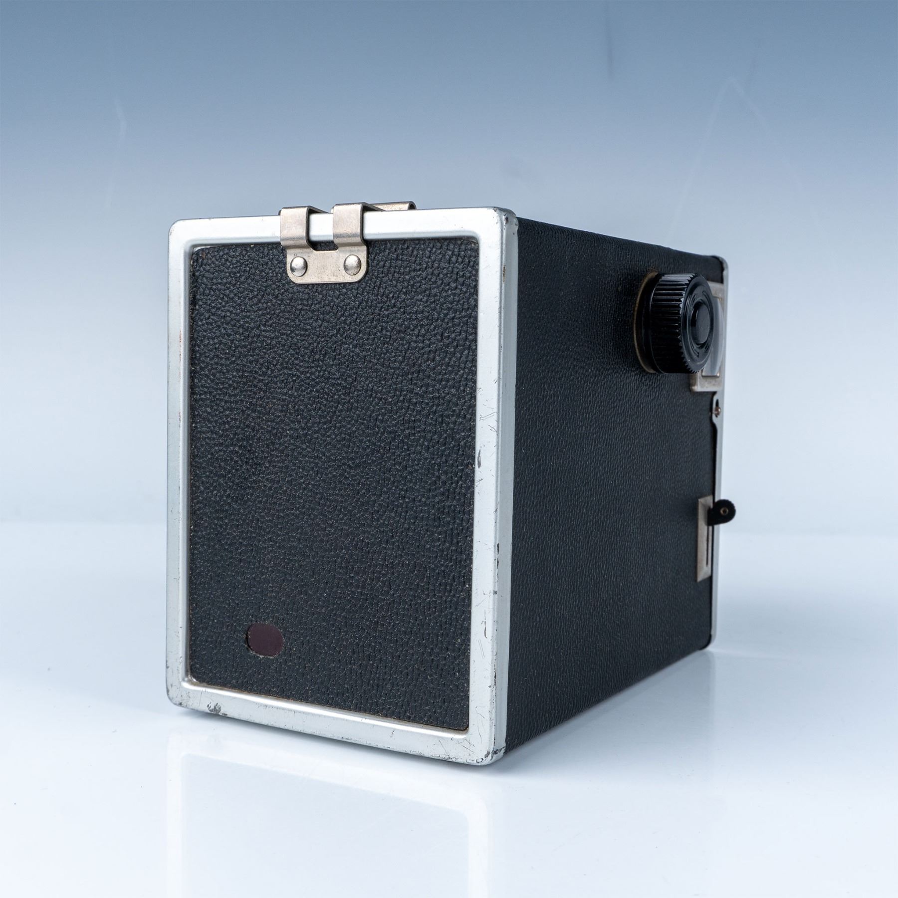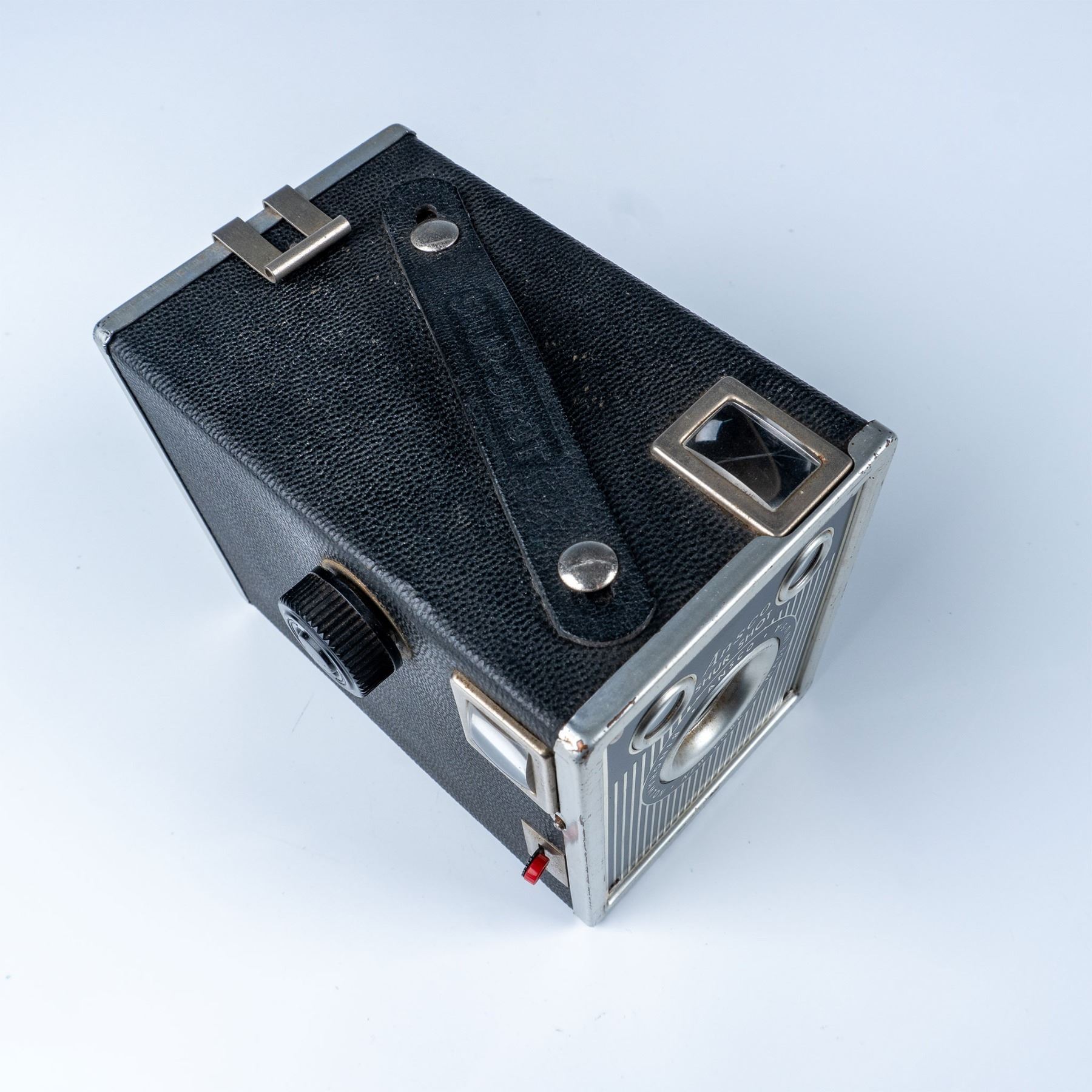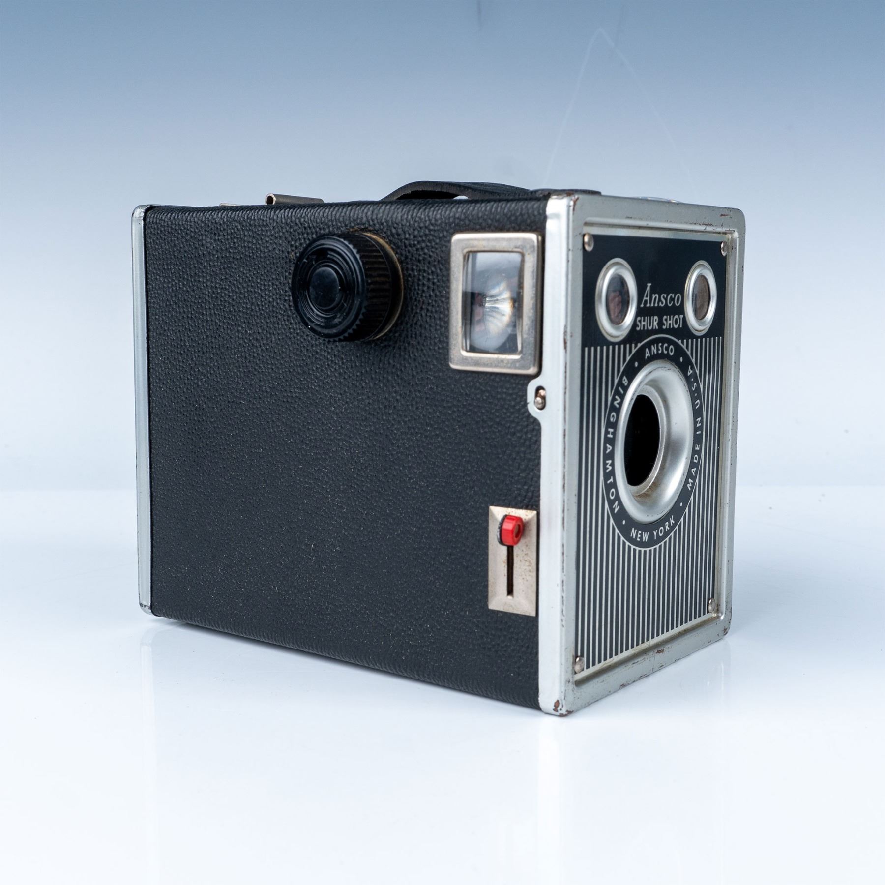 Vintage Ansco Shur Shot box camera, manufactured in Binghamton, New York, USA. Designed for simplicity and durability, this camera features a metal body covered in black leatherette with silver accents and a carrying strap on top. The front panel displays the Ansco branding along with a dual-lens setup for a classic box camera design. Known for its ease of use, the Shur Shot was popular in the mid-20th century for amateur photography. The back includes a film advance knob and a red window to monitor film progression.