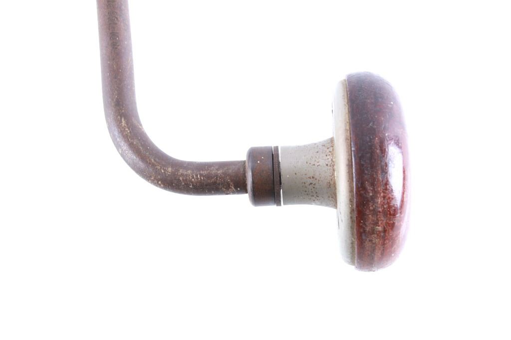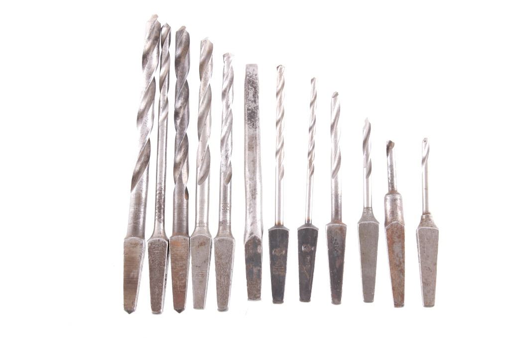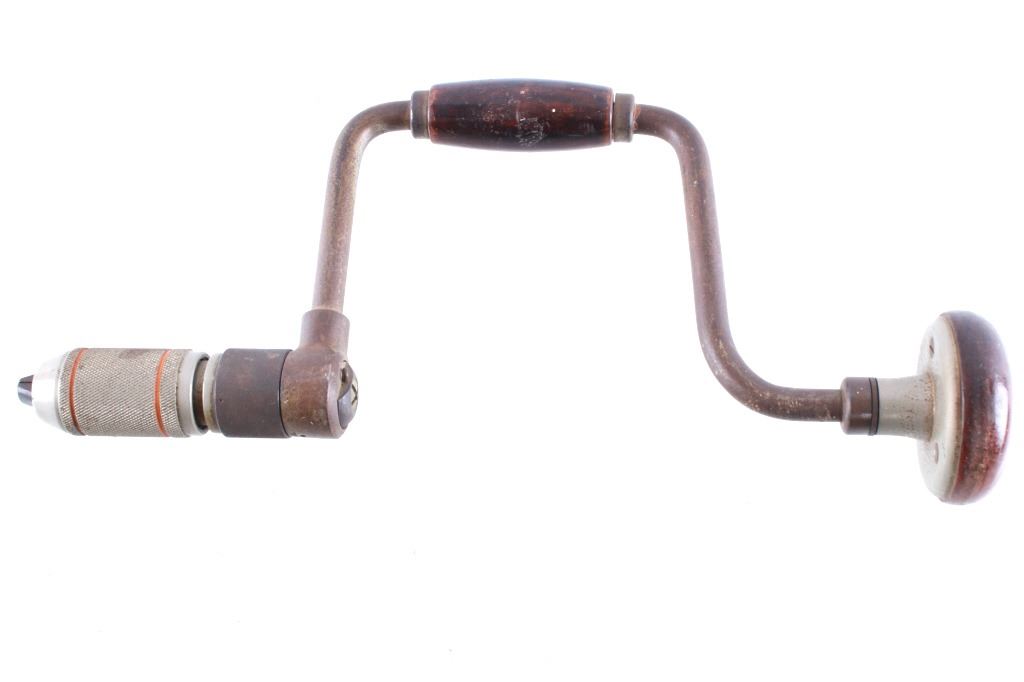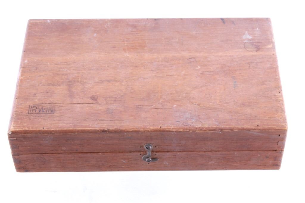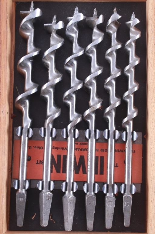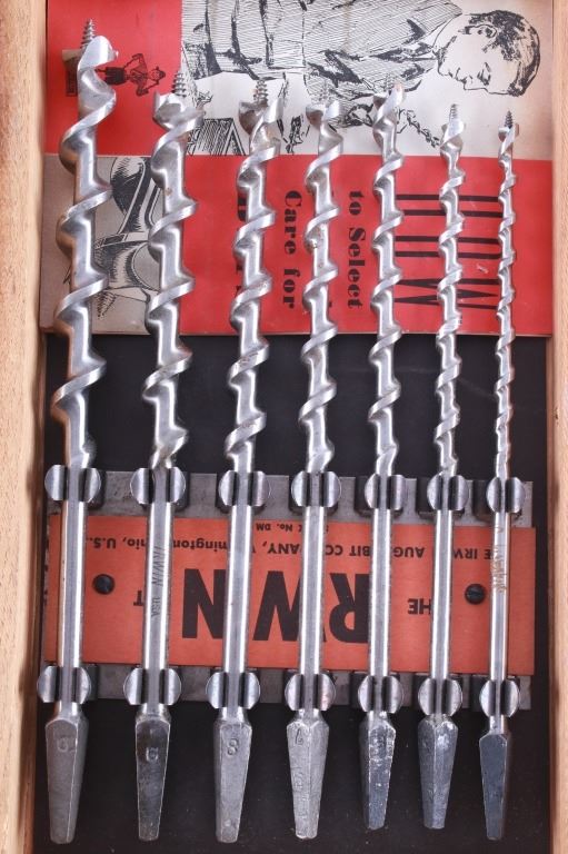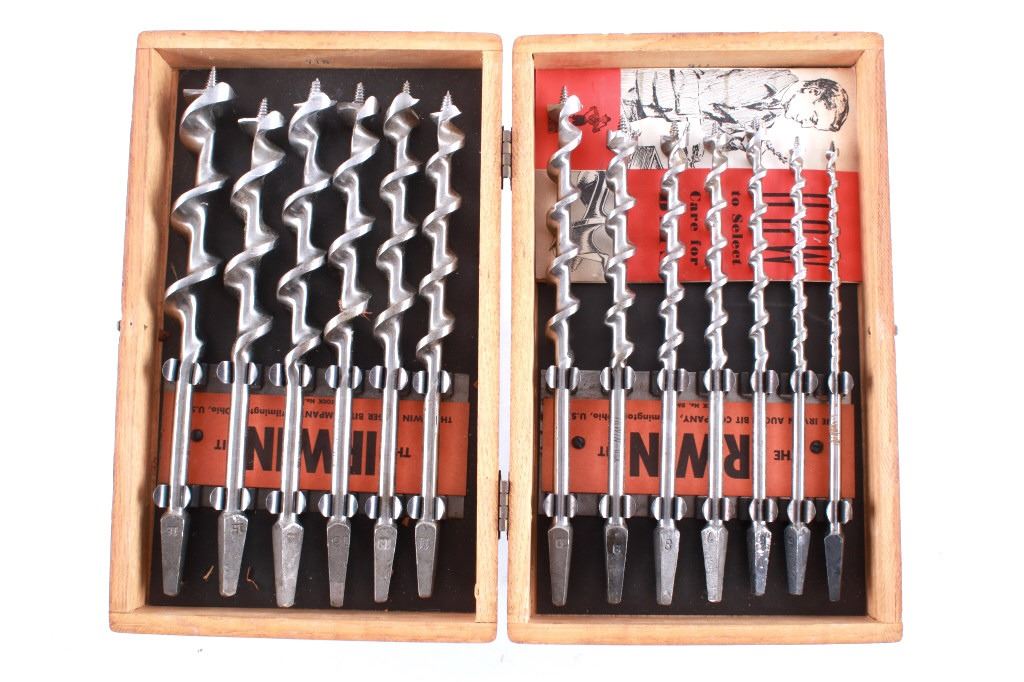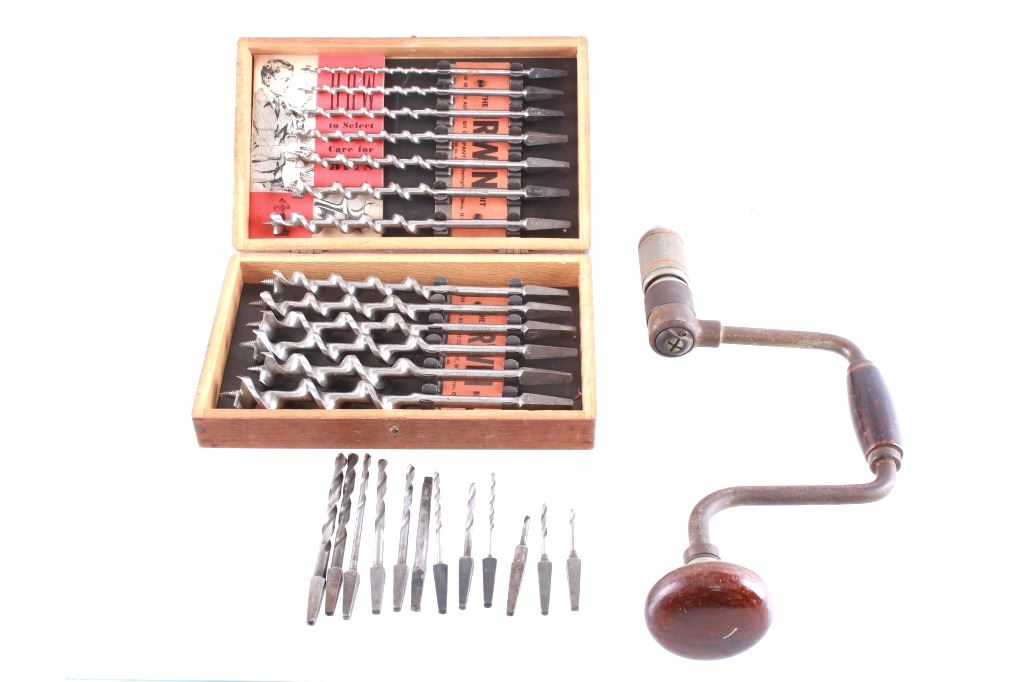 Featured in this lot is a vintage, 1950s Irwin Auger drill bit complete set, a Stanley No. 921 10 inch ratchet bit brace hand drill, and a set of Standard Tool Co. drill bits. In 1884 Charles Irwin owned a pharmacy in Martinsville, Ohio. A local blacksmith who was a customer of Mr. Irwin's came up with the idea for a solid center auger bit. He sold the rights to this invention to Mr. Irwin and a year later, after patenting the Auger bit, Charles Irwin, along with four other business partners formed the Irwin Auger Bit Company. The Irwin bit set comes in the original wood box with all 13 original drill bits, the original "How To Select, Use And Care For Bits" small booklet and the original metal "The Irwin Bit" plates. The exterior of the box shows "Irwin" printed in black on the top of the box and a worn of sticker on the left side giving the drill bit measurements. The box features a small hook latch to securely close the box. The box measures 6 1/4" L x 10 1/4" W x 2 1/2" D. The second item in this lot is this Stanley No. 921 10 inch ratchet bit brace hand drill. The Stanley Works was founded by Frederick Trent Stanley in 1843, originally a bolt and door hardware manufacturing company located in New Britain, Connecticut. The Stanley Rule and Level Company was founded in 1857 by Frederick Trent Stanley's cousin, Henry Stanley, also in New Britain. In 1920, this company merged with the Stanley Works, and continued operating as its hand tools division. Stanley Hand Tools is a division of Stanley Black & Decker following the merge with Black & Decker in March 2010. The hand drill features a metal construction with a wood handle in the middle and a wood knob handle at the top for easy, comfortable holding. The hand drill is fully functional and working. The drill measures 14 3/4" L x 6 1/4" W. The third item is a set of 12 Standard Tool Company drill bits. The drill bits come in various sizes and all seem to be undamaged. The largest measures 5 1/4" L and the smallest measures 2 7/8" L.