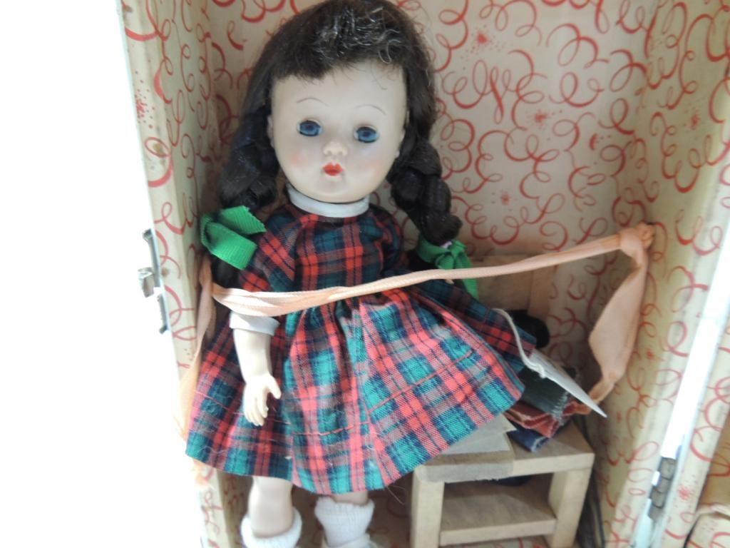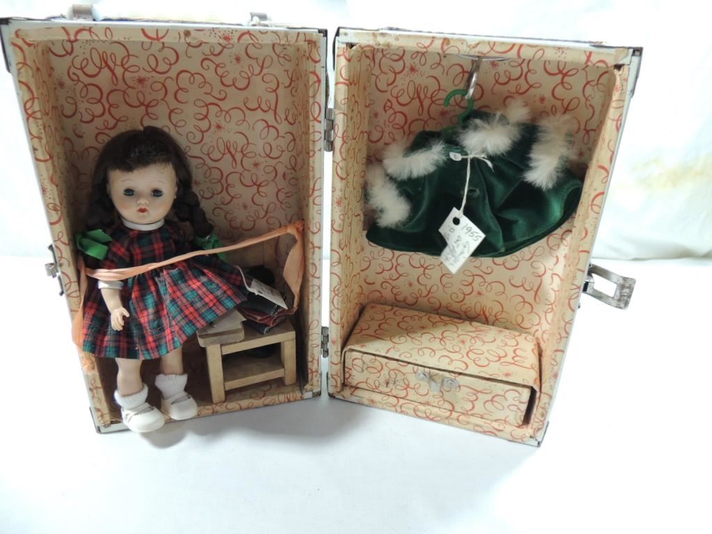 FIRST GINGER DOLL GOOD CONITION EXTRA GREEN VELVET OUTFIT SCHOOL DESK WITH BOOKS ACCESSORIES, IN VINTAGE DOLL TRUNK COLLECTIBLE. BROWN HAIR SLEEP EYES, AS SHOWN SEE PHOTO FOR MORE DETAILS.