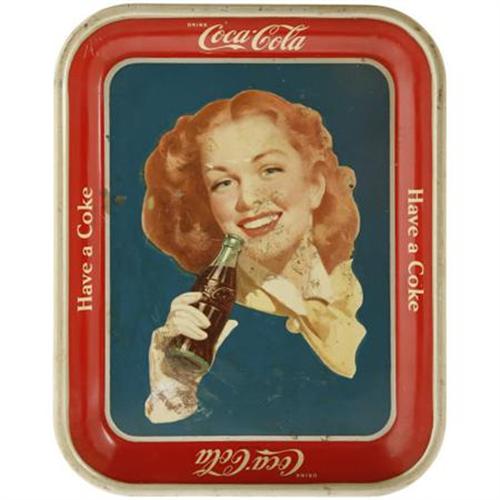 <B>1950s Girl with Bottle Serving Tray Rare Version</B></I> Featuring a red-haired Coca-Cola model on a solid teal blue background, this tray is the uncommon variety. Scuffing appears on the model's face and hand with a spot in the field beside her. The more common tray has a screened background as opposed to solid.<BR><BR><b>Shipping:</b> Miscellaneous Collectibles, Smal (<a target="_blank" href="http://www.heritageauctions.com/common/shipping.php">view shipping information</a>)