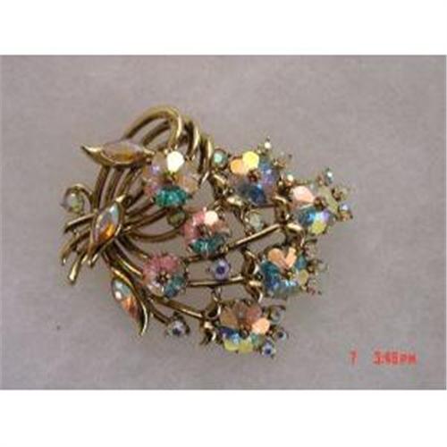 Here is a very delightful signed HOLLYCRAFT brooch from the 1950s is my guess. There are faceted aurora borealis stones of varying shapes and sizes. The larger ones in the center are held intact by 8 individual prongs and a gold colored metal piece in the center with tiny like little leaves. This is very detailed, and appears to be a tree or something like that?? If you know what this is please email me so that I may correct my information. There are also stones on the lower end of the brooch. There are smaller circular aurora borealis stones throughout the entire brooch. This appears to be in excellent original condition