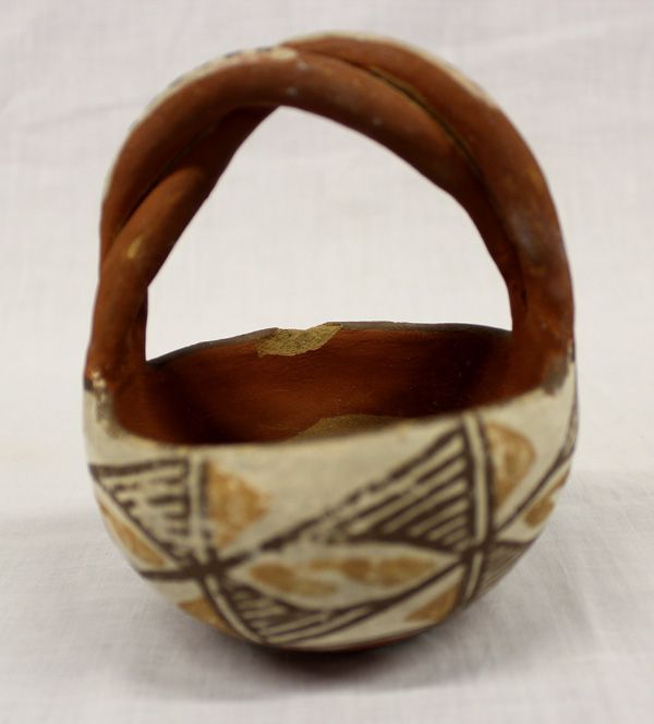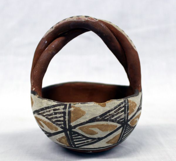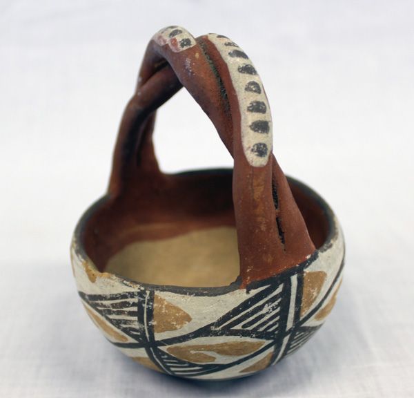 1950s Isleta Polychrome Pottery Basket, measures 4'' x 5'', features twisted handle and geometric and abstract designs