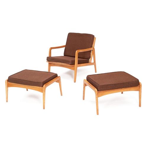 1950s Italian Modern chair and two ottomans, made in Italy, maker unknown, blond wood frame with loose cushions, each stamped "Made in Italy", original finish, chair: 27.5"w x 29"d x 30"h, ottoman: 25"w x 18"d x 14.5"h, fair condition