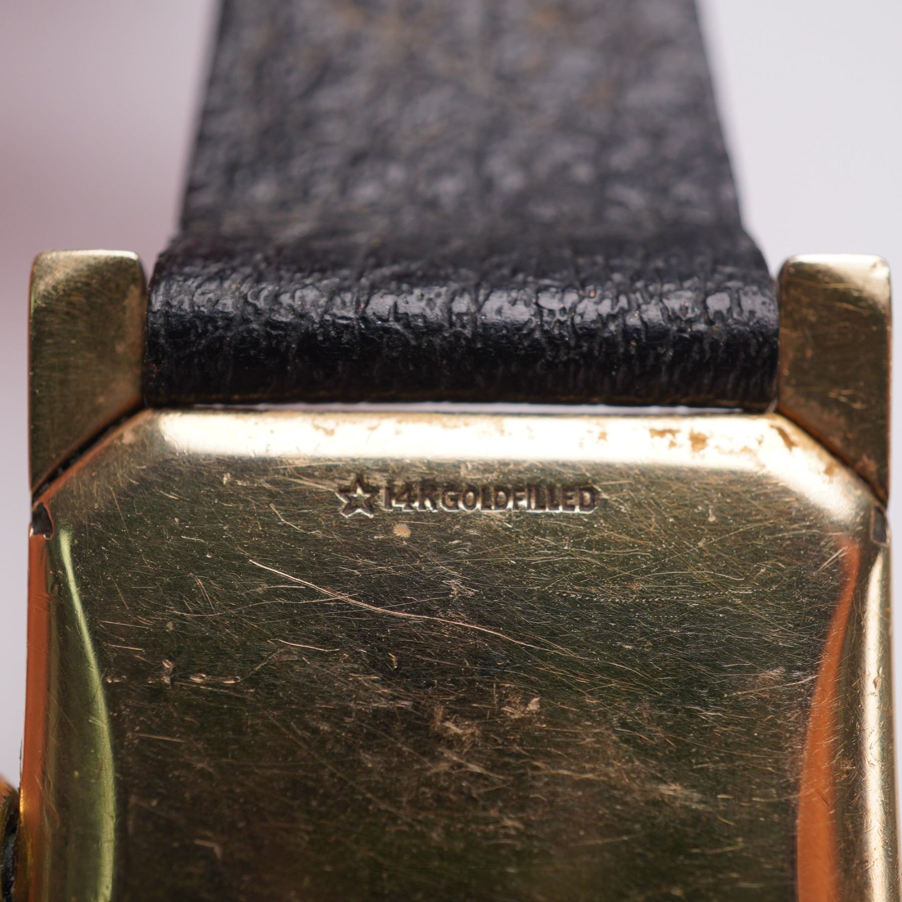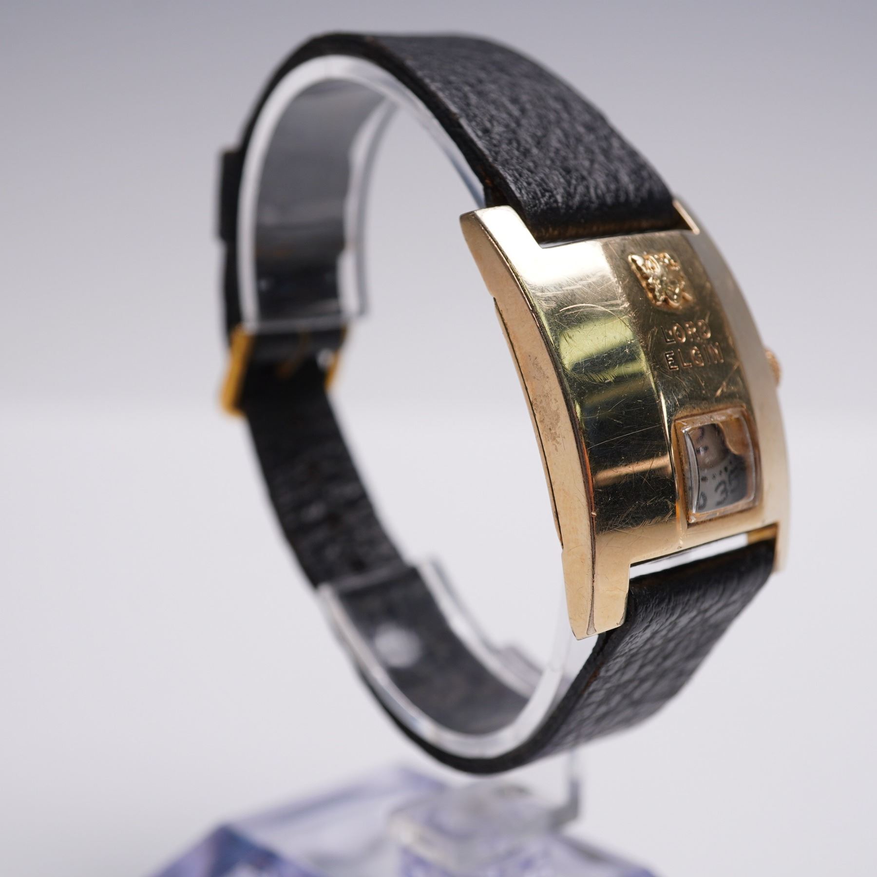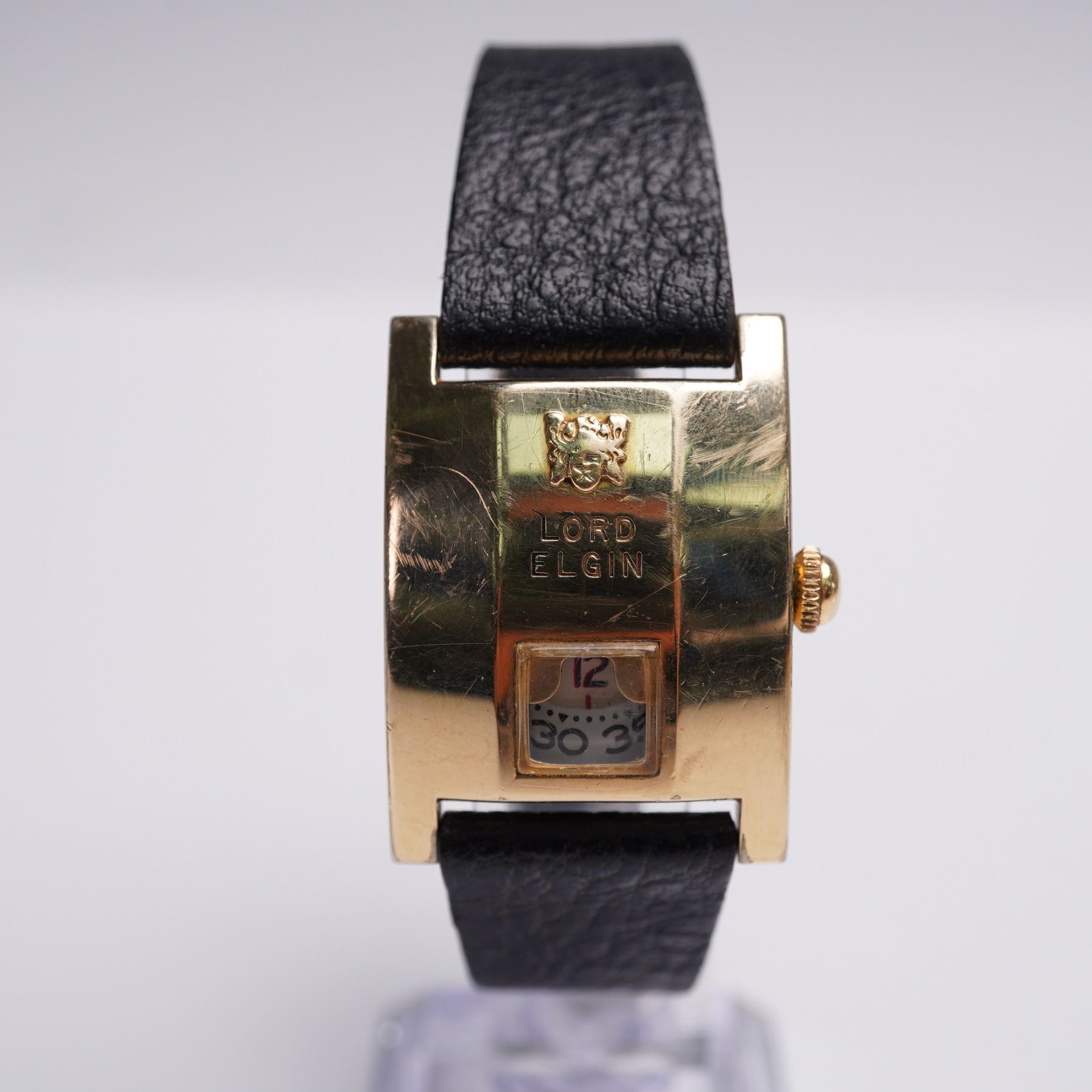 A true standout in mid-century horology, this vintage Lord Elgin direct-read wristwatch is a rare find and a bold statement piece from the 1950s. Featuring a unique jump hour digital display with rotating discs instead of traditional hands, this futuristic design was well ahead of its time. Housed in a sleek rectangular 14K gold-filled case stamped L&K GOLDFILLED, the watch exudes the refined elegance Elgin was known for, with a richly patinated black leather strap completing its classic presentation. The sculpted crest above the Lord Elgin name on the case adds a regal touch, while the miniature window below reveals the hour and minute numerals in dramatic Art Deco fashion. A striking collector's item with retro-modern flair, perfect for vintage watch aficionados or design enthusiasts alike.