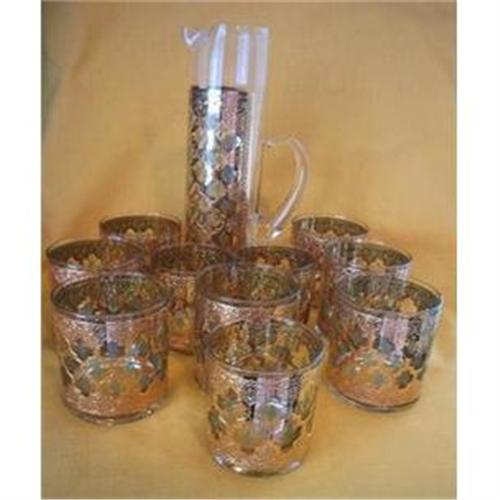 This 10 piece glass martini set with applied green diamonds encased in a heavy gold scrollwork, covering 3/4 of the pitcher and glasses has no makers mark. From the 1950's, elegantly made, it is in very good + condition without chips, cracks or fleabites and consists of the pitcher which measures 10 3/4 inches tall and 2 7/8 inches across the base, 7 large tumblers that measure 3 1/4 inches tall and 3 1/8 inches in diameter and 3 smaller tumblers that measure 3 inches tall and 2 7/8 inches in diameter. Makes a beautiful showing on any table and an addition to any Vintage Martini Set Collection. <BR>SH & Ins. will be quoted after orders placed. If you have questions contact me and thank you for looking.