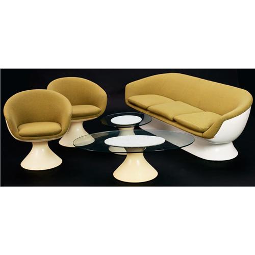1950s Modern living room suite, in the style of Eero Saarinen, maker unknown, consisting of an upholstered sofa, a pair of swiveling lounge chairs and two glass-top tables, all with molded fiberglass bases, unmarked, sofa: 84"w x 30"d x 27.5"h, chairs: 28