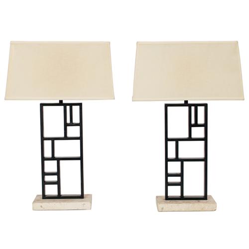 1950s Modern table lamps, pair, geometric black enameled metal forms over travertine marble bases, unmarked,11in.w x 7in.d x 32in.,very good condition