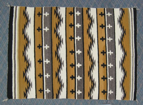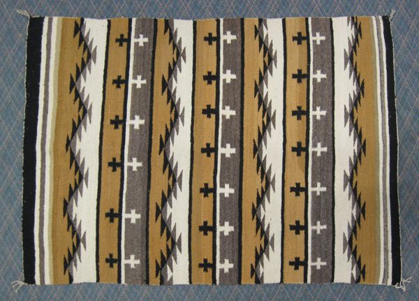 From the Southwestern Americana Collection Scottsdale AZ we have a 1950s Navajo Cross Directional Rug, measures 60''L x 41''W, woven in ochre, white, and gray cross pattern, 4 cornered tassels