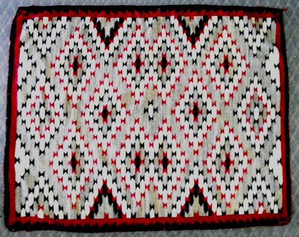 1950s Navajo Western Reservation Rug. Very large (7'4'' x 5'8'')classic diamond design red, black, grey and white Navajo rug. The edges have some damage and there are discolored areas consistent with normal wear and tear for age.
