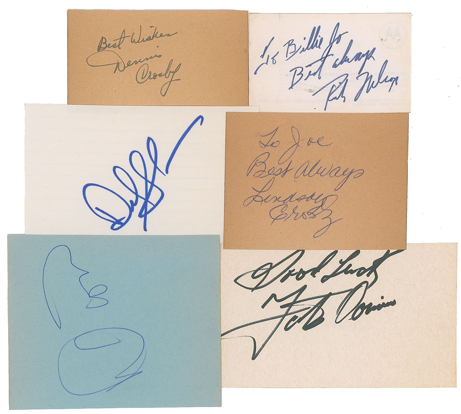 Grouping of six cards or sheets, ranging in size from 3.5 x 2 to 5 x 3, each signed in ballpoint or felt tip by a rock star from the 1950s, including: Dennis Crosby; Lindsay Crosby (ins); Dion; Fats Domino; Ricky Nelson (ins); and Del Shannon. In overall fine condition.