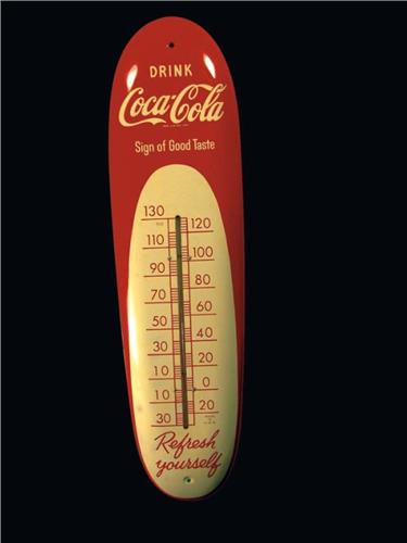 1950s Tin Coca Cola Thermometer, Sign of Good Taste. Near mint condition. 30 inches tall.