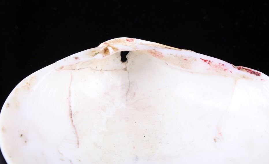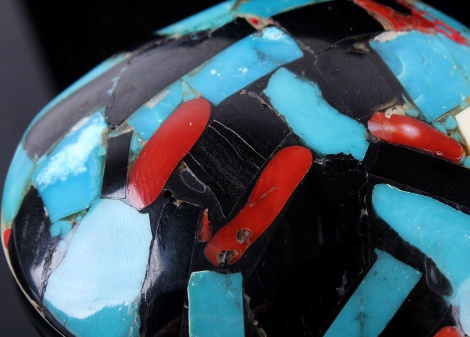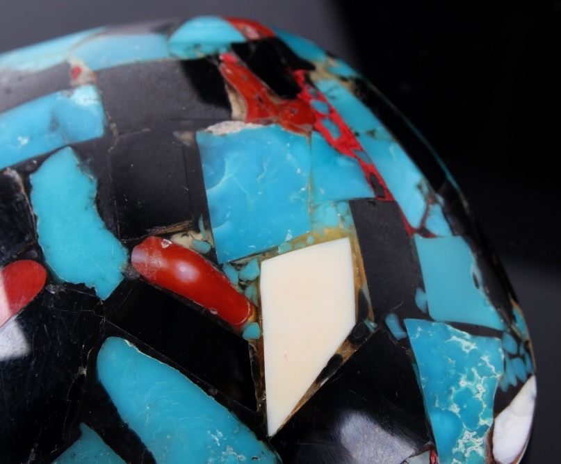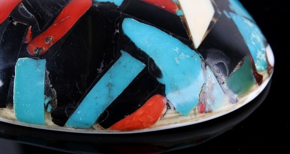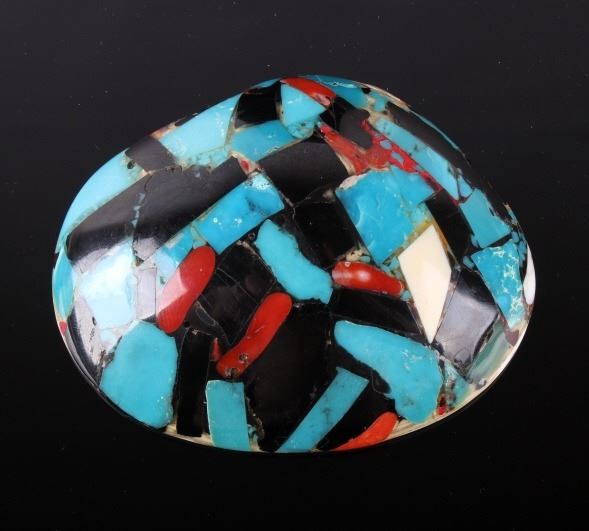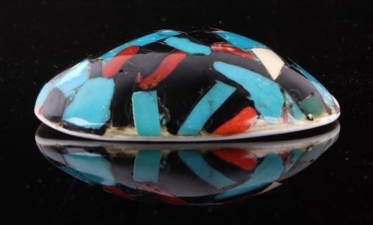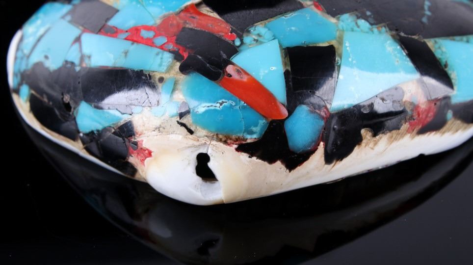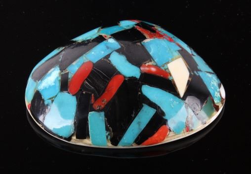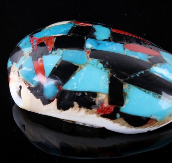 Featured in this lot is a beautiful Zuni Native American Inlaid Mosaic Shell Necklace Pendant, c. 1950's. The shell shows stunning color pattern with inlaid turquoise, black onyx, and coral. The Zuni are Native American Pueblo peoples native to the Zuni River valley. The current day Zuni are a Federally recognized tribe and most live in the Pueblo of Zuni on the Zuni River, a tributary of the Little Colorado River, in western New Mexico, United States (Wikipedia). This pendant is in good condition and measures 3.5" x 2.5".