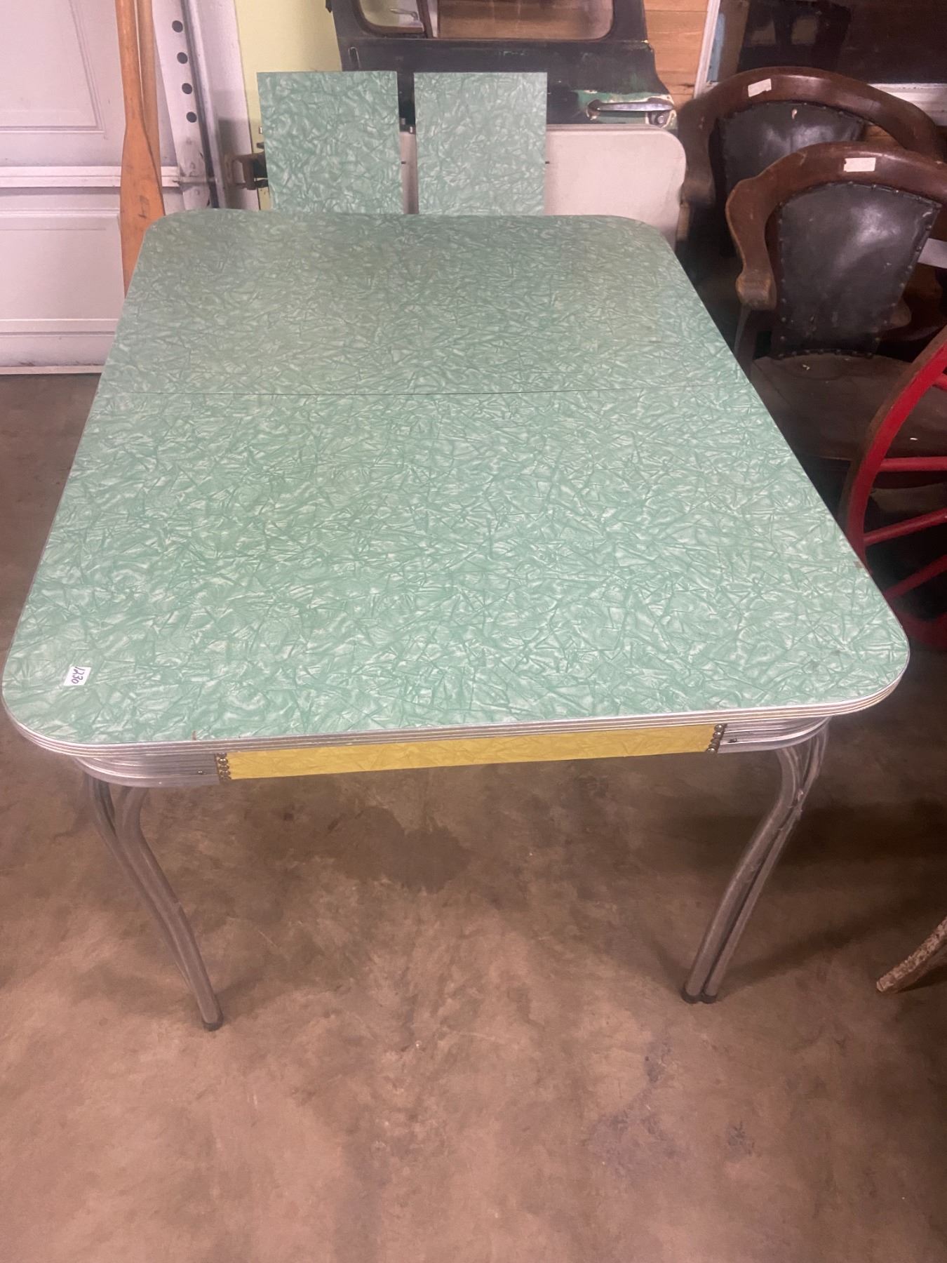1950s chrome table, comes with 2 leaves - 48"x36" closed & 70"x36" open - has some small damage