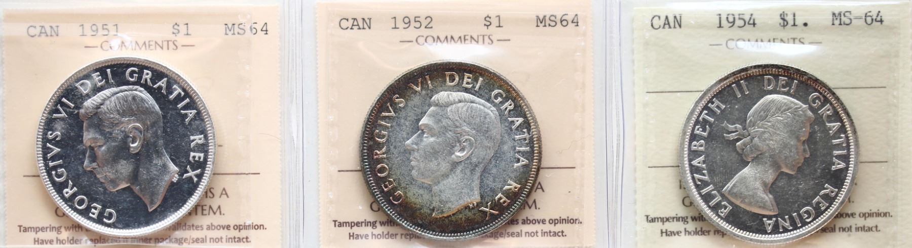 1951 $1, 1952 "WL", 1954, All 3 coins ICCS Choice Mint State-64