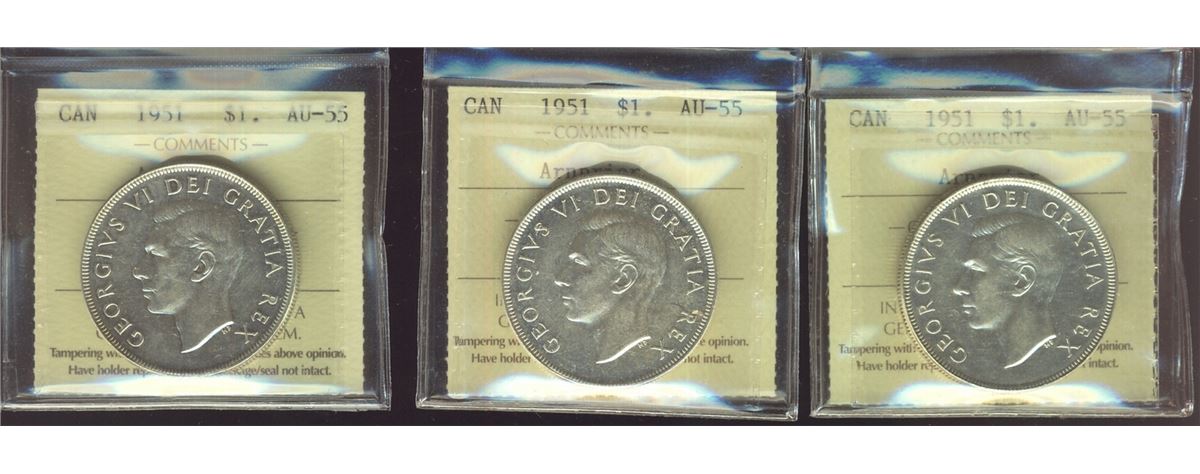 1951 $1 Arnp ICCS AU55. Lot of 3 coins.