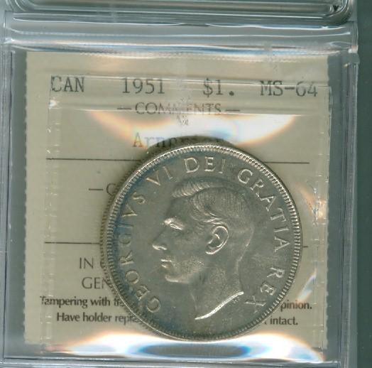 1951 $1 Arnprior ICCS MS64.Light shade of blue tone on obverse alone.
