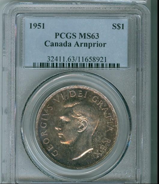 1951 $1 Arnprior PCGS MS63. Superb eye appeal, looks better.