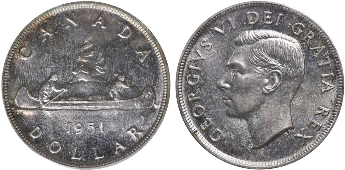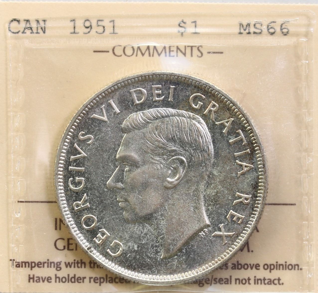 1951 $1 ICCS "DBL 19" Superb Gem Mint State-66. A conditional rarity with superb luster and eye appeal, showcasing a newly discovered doubled die reverse variety. This coin is the best of both worlds, being an unsurpassable registry level coin, while also possessing a prominent and previously undocumented doubled die reverse, which finds itself recognized by ICCS as "DBL 19". The doubled die on this coin is impressive, and uncommon for the silver dollar series. The "19" of the date has intense doubling, with fully split serifs and a major shift, essentially two separate "19"s slightly from eachother. Although the ICCS insert only makes note of a doubled 19, the coin does in fact have strong doubling on many other parts of the reverse design, such as the hands of the voyageur as well as the paddle which he is holding. The coin itself has a hammered strike and is blanketed in a satiny rolling mint bloom. The surfaces are untouched and mostly blast white, save for a bit of scattered golden toning, and some golden rim toning. A most impressive example and of major importance for anyone building a set of finest certified examples.
