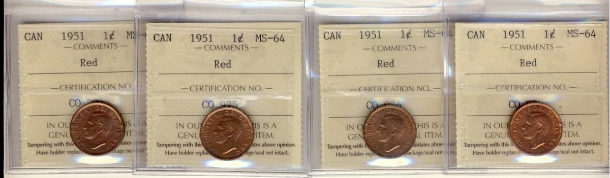 1951 1¢ ICCS MS64RD. Lot of 4 coins.