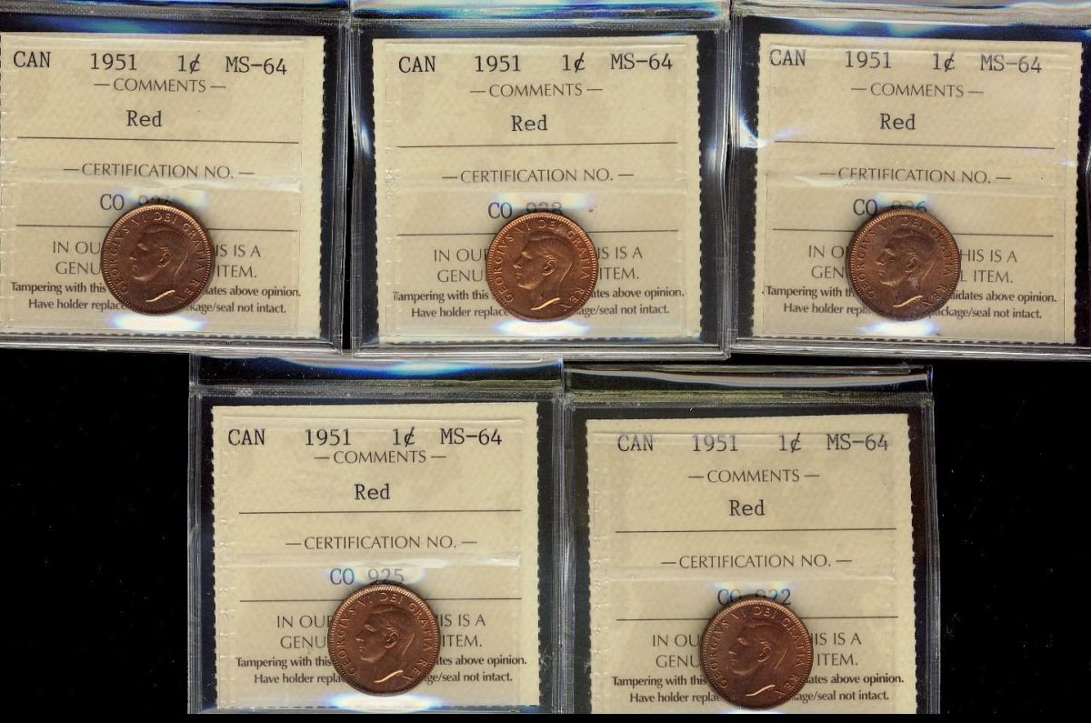 1951 1¢ ICCS MS64RD. Lot of 5 coins all red.