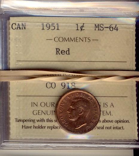 1951 1¢ ICCS MS64RD. Lot of 5 coins.