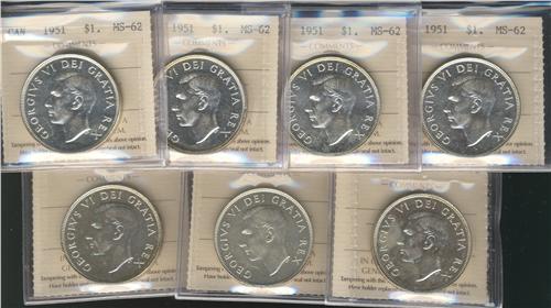 1951 $1. Lot of 7 ICCS certified coins MS62