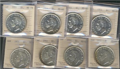 1951 $1. Lot of 8 ICCS certified coins MS60.