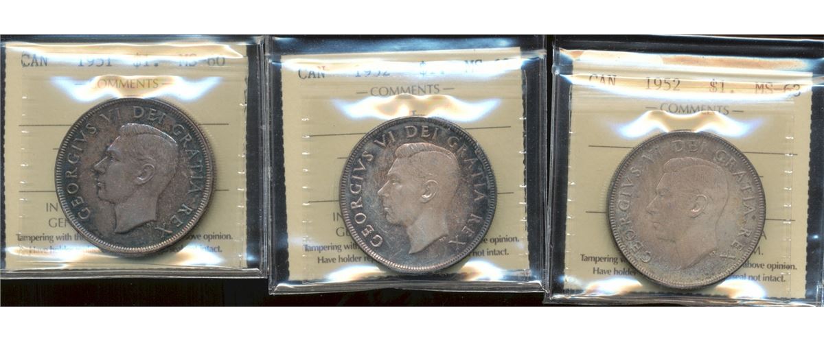 1951 $1 MS60, 1952 WL & 1952 SWL both MS63. Lot of 3 ICCS graded coins all with superb tones and eye appeal..
