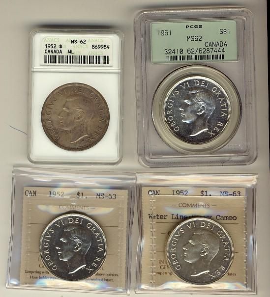 1951 $1 PCGS MS62, 1952 ANACS MS62, 1952 SWL ICCS MS63 & 1952 ICCS MS63 Heavy Cameo. Lot of 4 silve