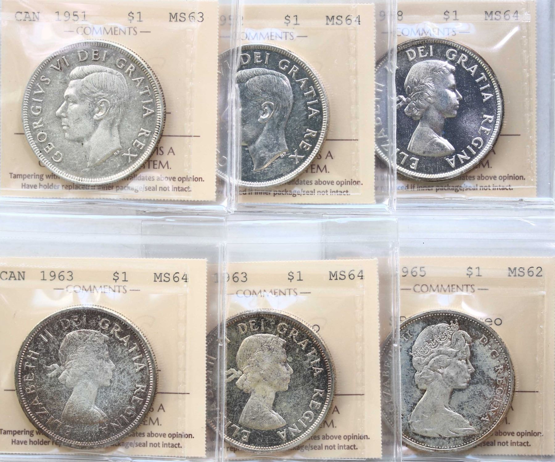 1951 $1 "SWL", 1952, "WL", 1958, 1963 (2), 1965 "SB B5", All 5 coins ICCS Choice Mint State-62 to Very Choice Mint State-64. Some issues with Cameo.
