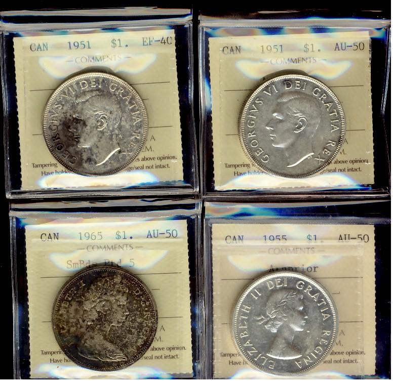 1951 $1 SWL EF40, Arnprior AU50, 1955 Arnp AU50 & 1965 Sm Bd Ptd 5 AU50. Lot of 4 coins all ICCS graded.