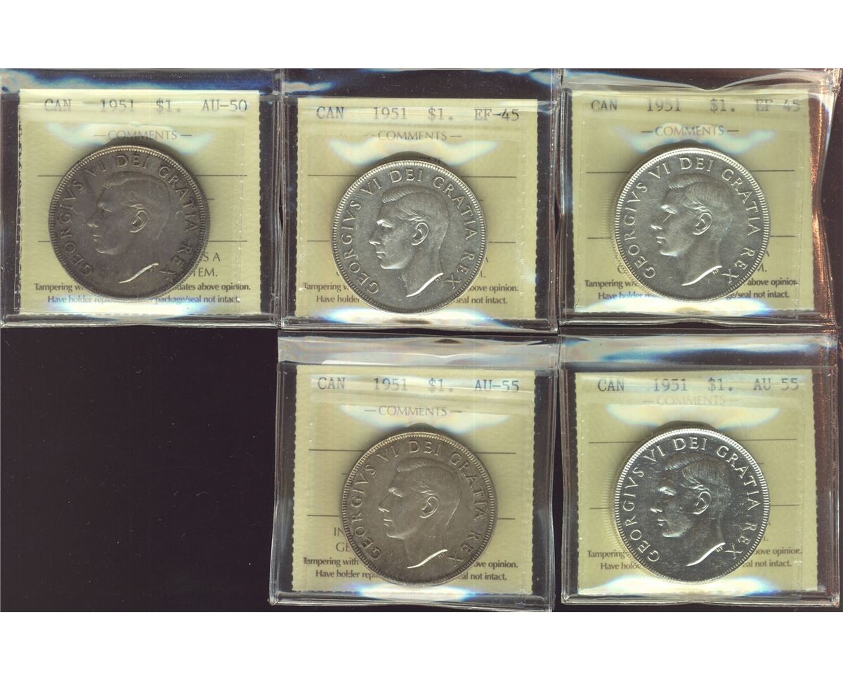1951 $1 SWL ICCS EF45 to AU55. Lot of 5 coins.