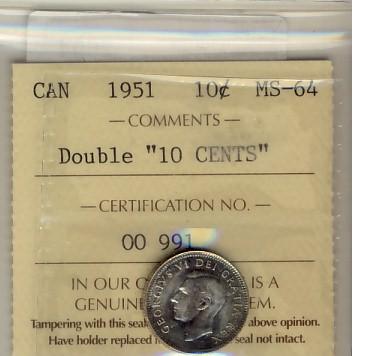 1951 10¢ Dbl '10 CENTS' ICCS MS64.