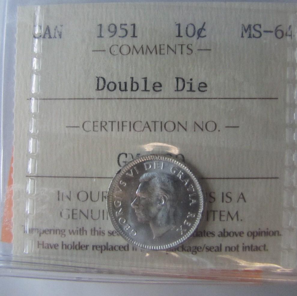 1951 10¢ Dbl Die ICCS MS64. Rarely offered.