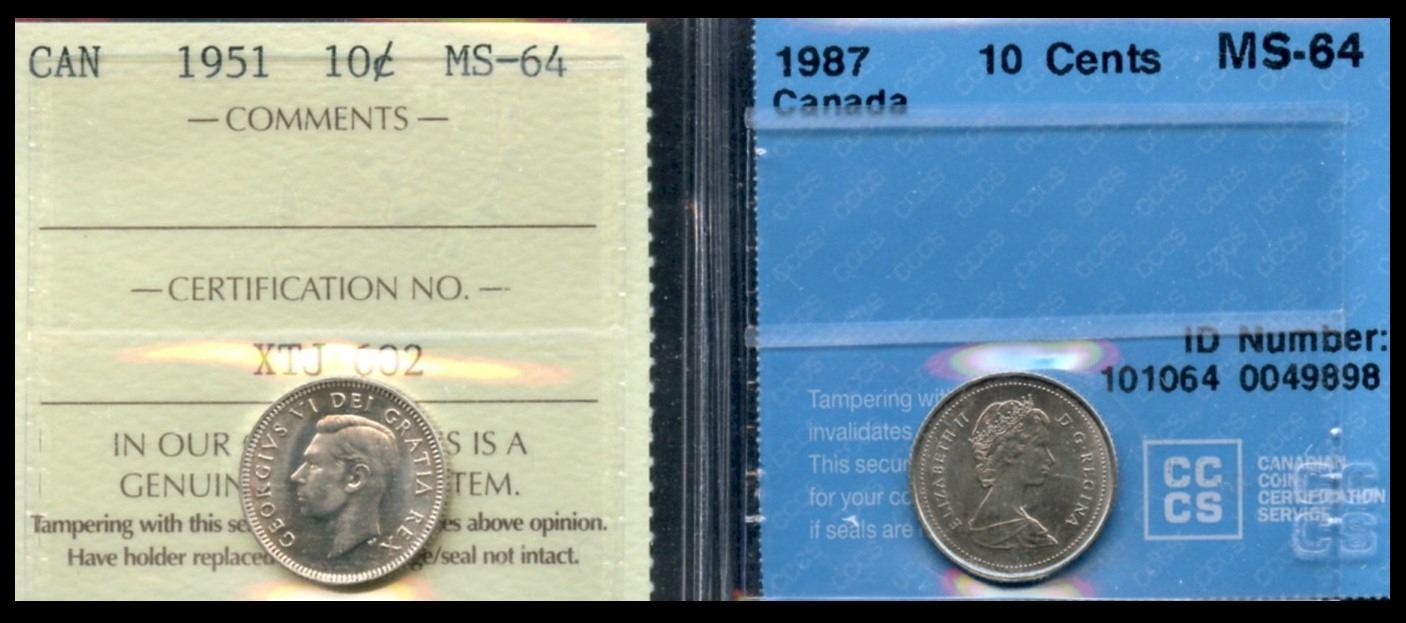 1951 10¢ ICCS Choice Mint State-64 & 1987 CCCS Choice Mint State-64. Lot of 2 coins