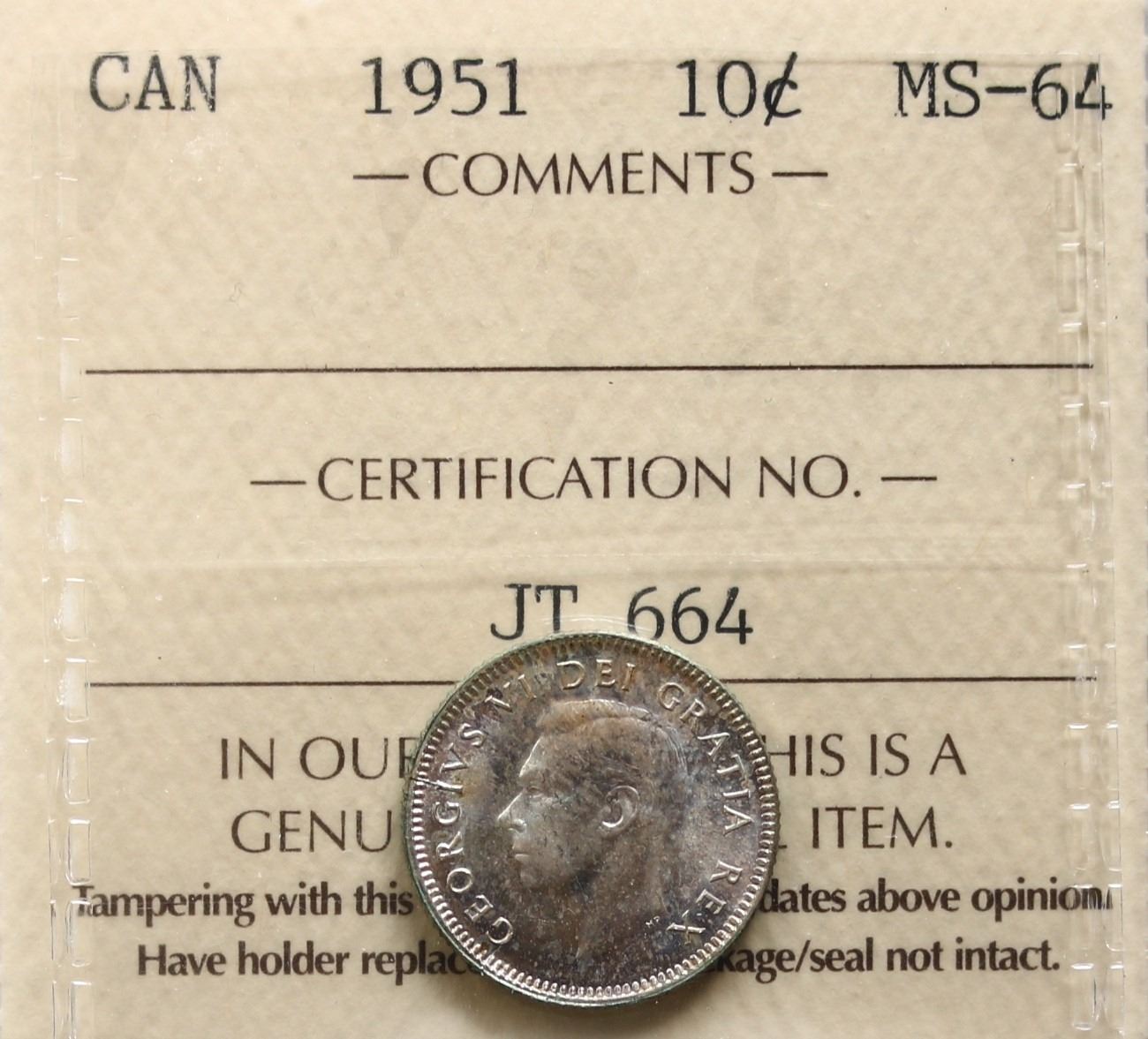1951 10¢ ICCS Choice Mint State-64