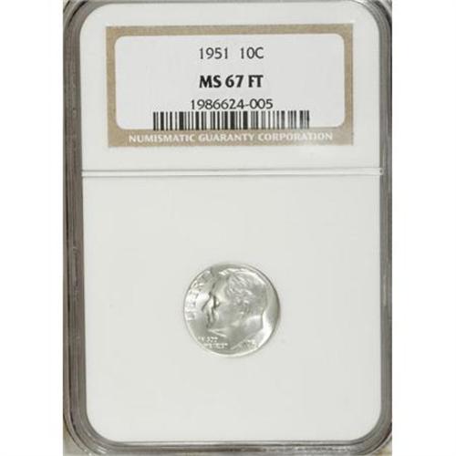 <B>1951 10C MS67 Full Bands NGC.</B></I> NGC Census: (0/0). PCGS Population (24/0). Mintage: 103,800,000. (#85097)<BR><BR><B>Coin Engraver:</B> John R. Sinnock<BR><BR><b>Shipping:</b> Coins & Currency (<a target="_blank" href="http://www.heritageauctions.com/common/shipping.php">view shipping information</a>)