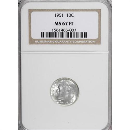 <B>1951 10C MS67 Full Bands NGC.</B></I> . NGC Census: (0/0). PCGS Population (24/0). Mintage: 103,800,000. (#85097)<BR><BR><B>Coin Engraver:</B> John R. Sinnock<BR><BR><b>Shipping:</b> Coins & Currency (<a target="_blank" href="http://www.heritageauctions.com/common/shipping.php">view shipping information</a>)