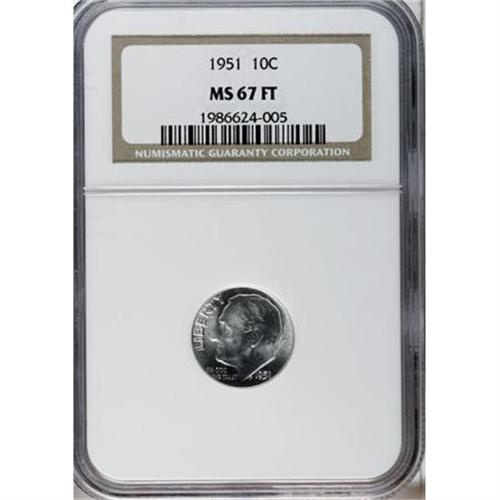 <B>1951 10C MS67 Full Bands NGC.</B></I> NGC Census: (0/0). PCGS Population (24/0). Mintage: 103,800,000. (#85097)<BR><BR><B>Coin Engraver:</B> John R. Sinnock<BR><BR><b>Shipping:</b> Coins & Currency (<a target="_blank" href="http://www.heritageauctions.com/common/shipping.php">view shipping information</a>)