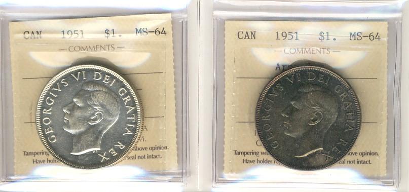 1951 & 1951 Arnprior $1. Lot of 2 coins both ICCS MS64.