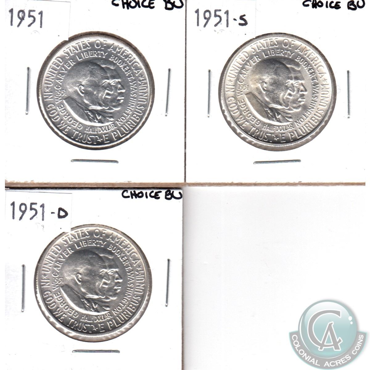 1951, 1951-S & 1951-D USA George Carver Booker T. Washington Commemorative Half Dollar Set. You will receive all Mint Mark versions of this coin. 3pcs