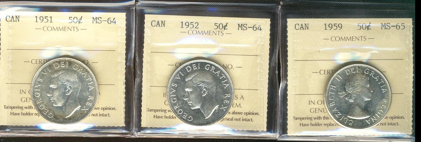1951 & 1952 MS64 & 1959 MS65 50¢. Lot of 3 ICCS graded coins.