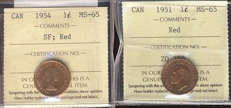 1951 & 1954 SF 1¢ ICCS MS65RD. Lot of 2 coins.