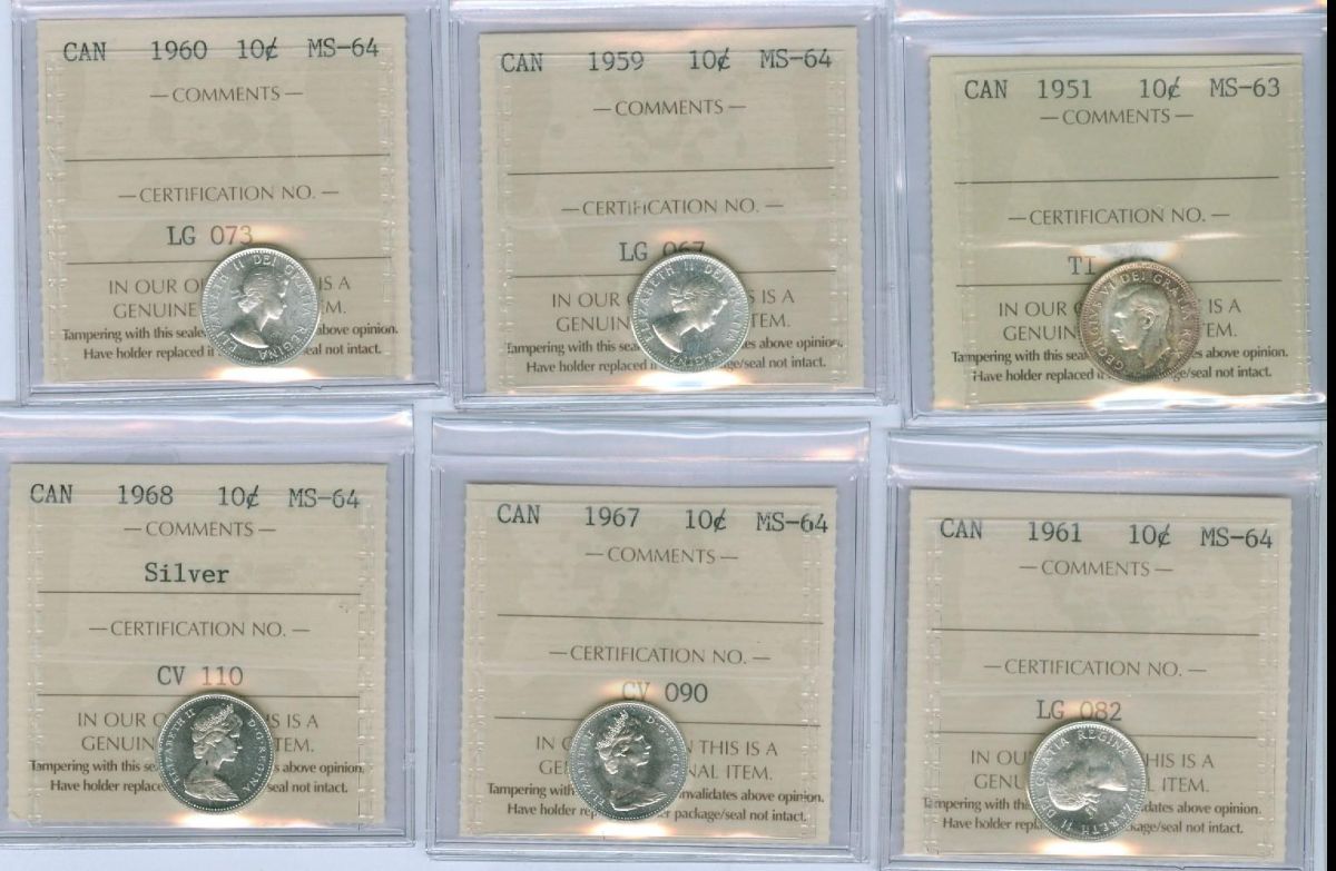1951-1968 10¢ ICCS. Lot of 6 coins including 1951 MS63, 1959 MS64, 1960 MS64, 1961 MS64, 1967 MS64 and 1968 MS64 (silver).