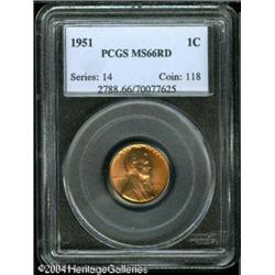 1951 1C MS66 Red PCGS. Well struck with blazing lu <B>1951 1C MS66 Red PCGS.</B></I> Well struck with blazing luster, and deep burnt-orange color near the right borders of both obverse and reverse. The reverse features numerous horizontal die polish lines (as struck), two or three carbon specks, and a moderate contact mark on the upper loop of the O in ONE, on the reverse. <BR><BR><B>Important notice:</B> Heritage usually auctions material at the rate of 200-250 lots per hour. On some occasions eBay Live bid software or the Internet may not be able to keep up with the pace of the auction. We recommend placing a realistic absentee bid now as insurance to avoid disappointment. Occasionally the auctioneer may eliminate or reject an eBay Live bid, and the auctioneer may also reopen a lot after the close of the eBay live bidding (usually because we missed an audience bid), and may reject your bid even if it shows you as the winning bidder. By bidding via eBay Live, you agree that Heritage may award the lot to another bidder at its sole discretion under the circumstances described above or any other reasonable circumstances. Since eBay bids are not shown to us until we open the lot on the floor, we treat those bids just like floor bids. In most cases the floor responds before the eBay bid is presented to us, due to Internet lag time, so for consistency we have made it a policy that floor bids are always considered first over tie eBay live bids. Also please note that all Heritage lots purchased through eBay Live carry a 20% Buyer's Premium. Please make sure you read the Terms and Conditions before you bid. This lot is being auctioned in conjunction with a live floor auction by Heritage Galleries & Auctioneers. All final auction and invoice information will be supplied by Heritage Galleries & Auctioneers, and all other information should be considered preliminary. Lot:5375