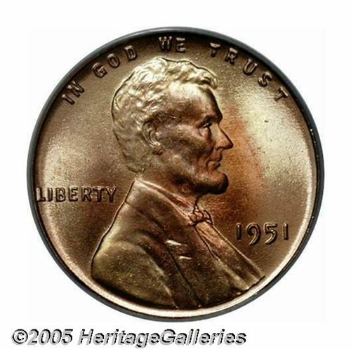 <B>1951<1C> MS67 Red PCGS.</B></I> Fully struck with resplendent luster and glorious mint crimson-red and lime-gold color. Unmarked on the reverse, with a couple of superficial marks on Lincoln's cheek and head. Population: 8 in 67, 0 finer (3/05).<BR><I>From The Tom Mershon #2 All-Time PCGS Registry Set of Lincoln Wheat Cents.</B></I>