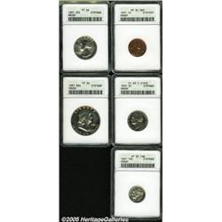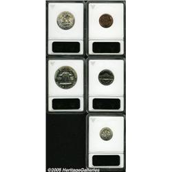 <B>1951 1C Proof Set PR63 to PR66 ANACS.</B></I> The set includes: <B>Cent PR64 Red,</B></I> luminous fire red color, distributed flyspecks; <B>Nickel PR63 5 Steps,</B></I> a hint of gold color, a few obverse toning flecks; <B>Dime PR65 Full Bands,</B></I> well struck and flashy with glimpses of aqua and russet patina; <B>Quarter PR66,</B></I> gentle tan color visits the margins, a fingerprint trace on the left obverse field; and a <B>Half Dollar PR64,</B></I> lovely golden-brown color adorns the borders, a few faint hairlines on the left obverse field. 5 Coins