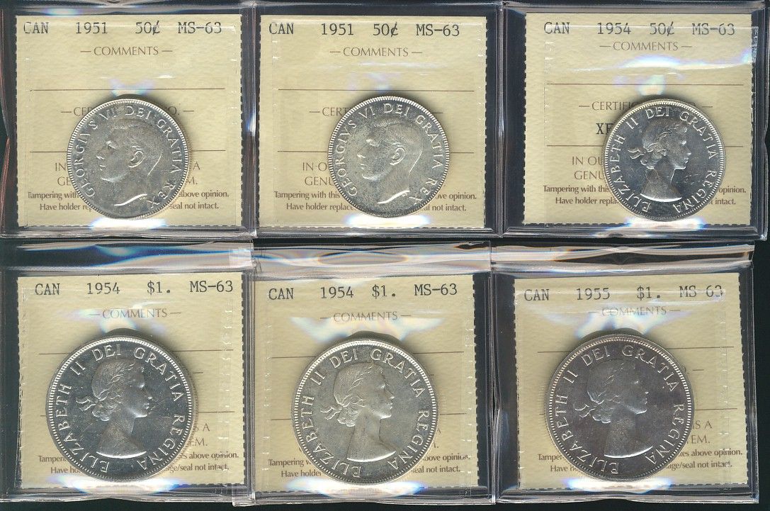 1951(2) 50¢ & 1954 with $1 1954(2) & 1955 ICCS MS63. Lot of 6 coins.