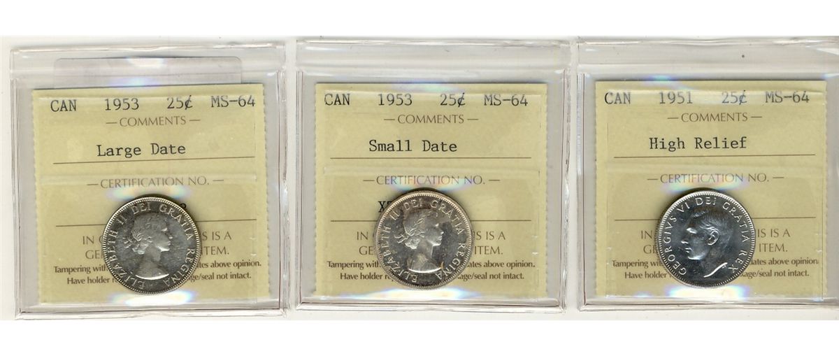 1951 25¢ HR, 1953 SD & 1953 LD ICCS MS64. Lot of 3 coins.