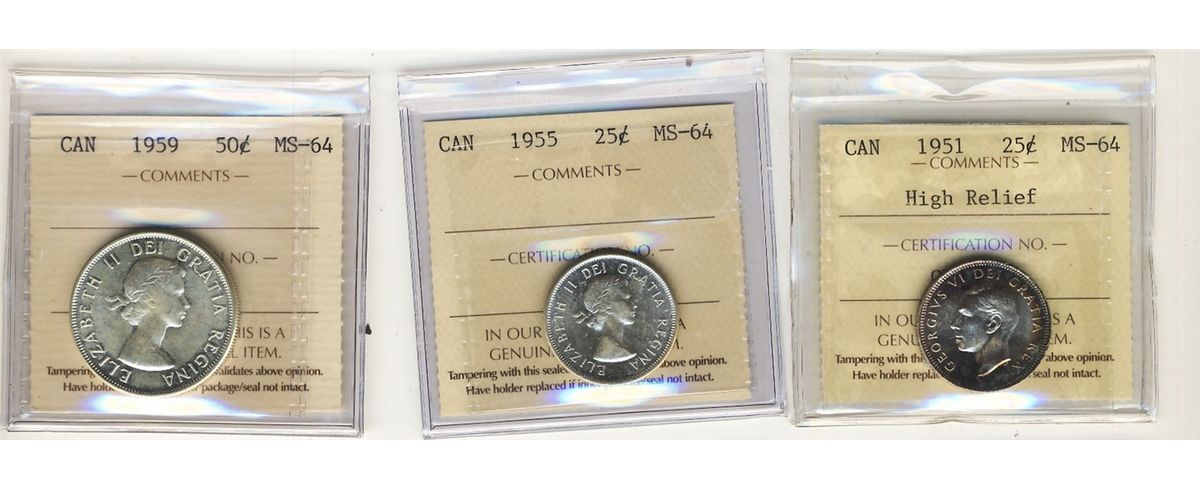 1951 25¢ HR, 1955 & 1959 50¢ ICCS MS64. Lot of 3 coins.